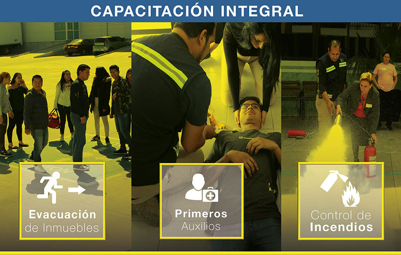 Elaboración de: •Plan de emergencia (medio riesgo). •Programa interno de protección civil con carta de corresponsabilidad (alto riesgo). •Simulacros. •Capacitaciones en primeros auxilios, combate de incendios, evacuación de inmuebles, cursos integrales en protección civil, trabajos en alturas, espacios confinados, con capacitadores registrados ante protección civil del estado de Querétaro y Guanajuato.